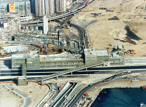 位 於 大 角 咀 的 機 場 鐵 路 車 站 進 行「平 頂」 , 該 車 站 是 七 個 機 鐵 站 中 首 個 完 成 結 構 工 程 的 車 站 , 該 站 被 命 名 為 奧 運 站
