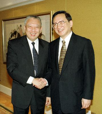 一九九八年八月三日(星期一) 圖片說明: 行政長官董建華歡迎外交部部長唐家璇。