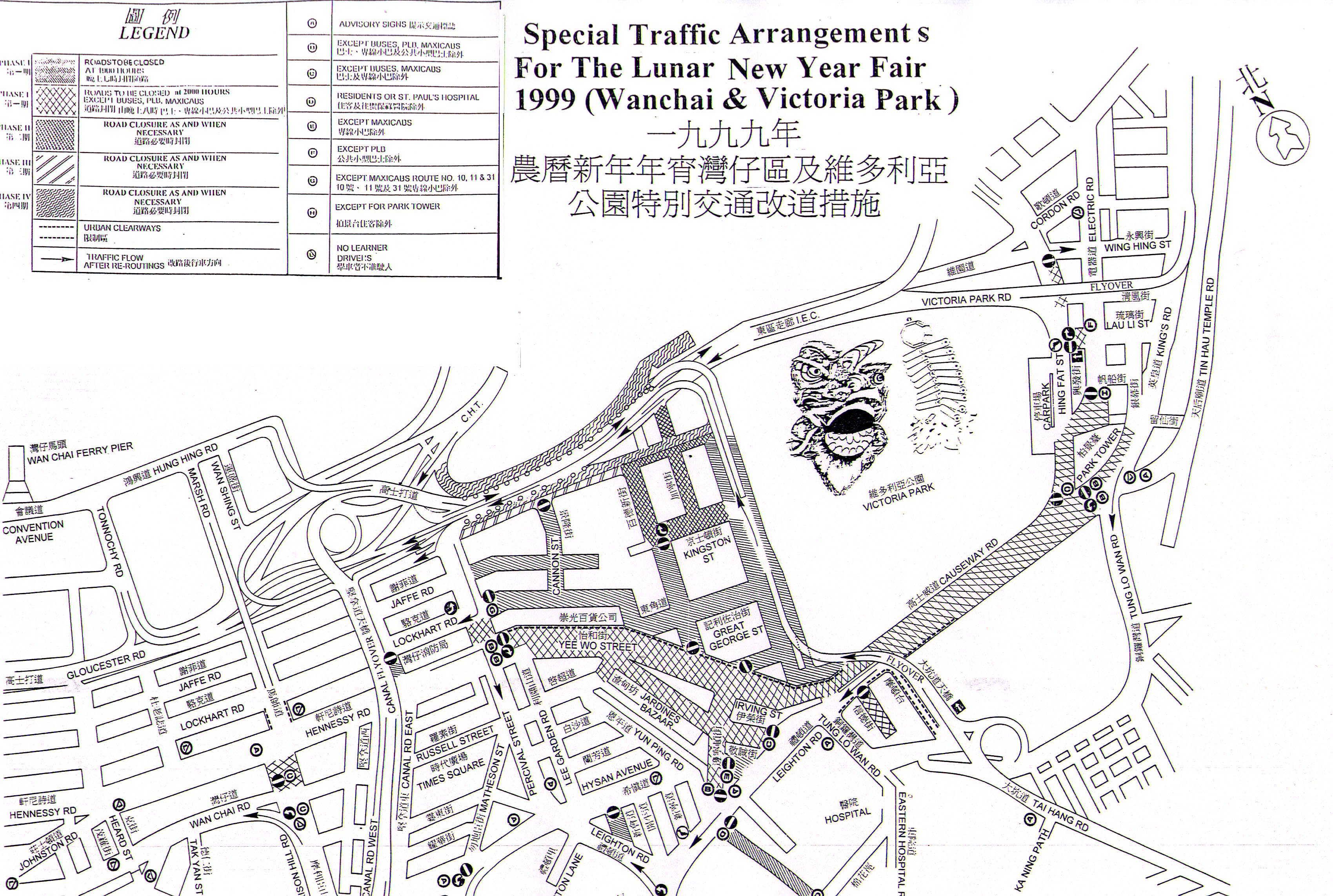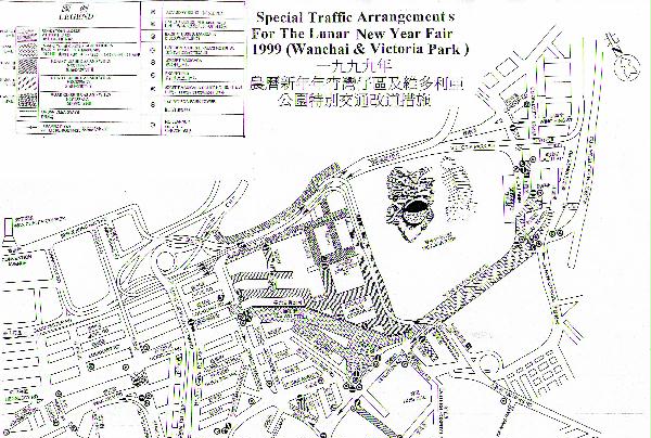 圖片(79K) / 圖片(1.6MB)說明: 一九九九年農曆新年年宵期間在灣仔區及維多利亞公園的特別交通措施圖。