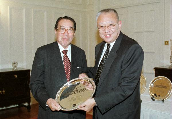 圖片: 行政長官董建華致送紀念銀碟予即將卸任的機場管理局董事會主席黃保欣,以感謝他在任內所作的貢獻。 一九九九年五月二十五日(星期二)