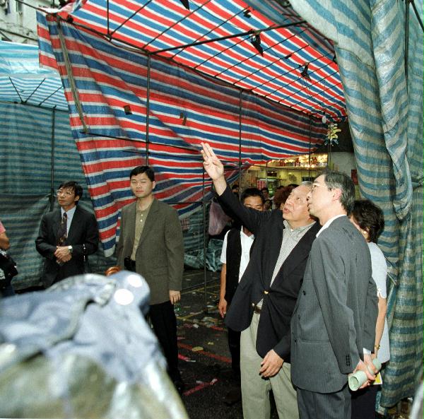 圖片: 圖示董建華巡視事發的小販攤檔。 一九九九年八月十一日(星期三)