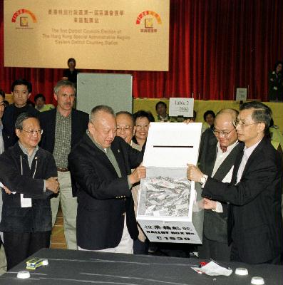 行政長官:我就答你第一個問題,一個人應該問一個問題。今天的選舉是在一個公開、公平公正的氣氛下進行。選舉的人數比一九九四年的區議會選舉多十二萬人左右,投票率是百分之三十五點八,比一九九四年的多了百分之二點七,所以我們覺得這次選舉是成功的。謝謝各位。