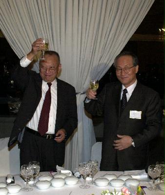 圖片: 行政長官董建華在大韓民國外交通商部部長洪淳瑛(右)的歡迎晚宴上為香港和韓國兩地的友誼祝酒。 完