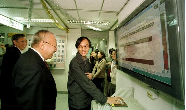 圖片: 行政長官董建華巡視香港城市大學並與一百多名城市大學學生交換意見。圖示董建華參觀城大無線電通訊實驗室的設施。 完