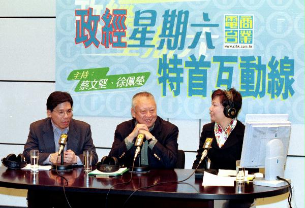 圖片: 行政長官董建華在商業一台兩小時的「特首互動線」節目中聽取市民的意見和回答問題。節目在政府總部直播。他並回答聽眾透過電郵發問的問題。 完