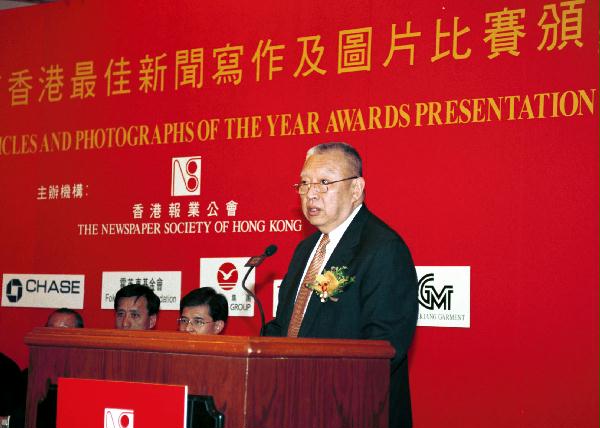 Photo: The Chief Executive, Mr Tung Chee Hwa, officiated at the presentation ceremony of the Best Press Articles and Photographs of theYear Awards 1999 organised by the Newspaper Society of Hong Kong at Island Shangri-La Hotel. Picture shows Mr Tung delivering a speech at the ceremony. End/Thursday, March 30, 2000 NNNN