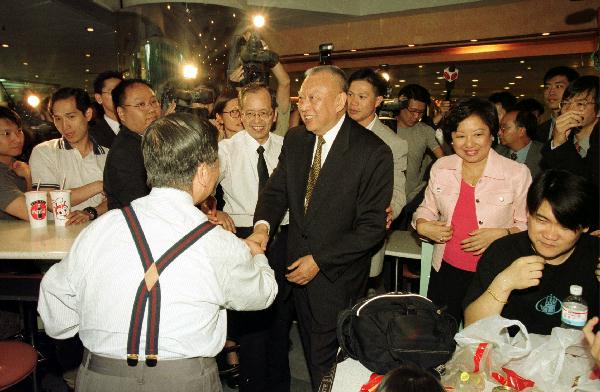 行政長官到訪公開大學前,前往旺角新世紀廣場巡視多間店鋪,並與在場的顧客交談。 圖片:董建華在離開大學前,與學生代表會面。 圖片:董建華在商場高層的美食廣場與市民閒談。 完
