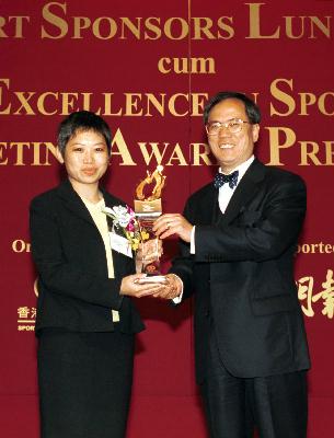 二○○○年十月三十日(星期一) 圖片:署理行政長官曾蔭權出席由香港康體發展局主辦的體育贊助商午宴暨傑出體育活動推廣選舉頒獎禮。圖示曾蔭權頒發最佳活動贊助獎予得獎機構渣打銀行代表。