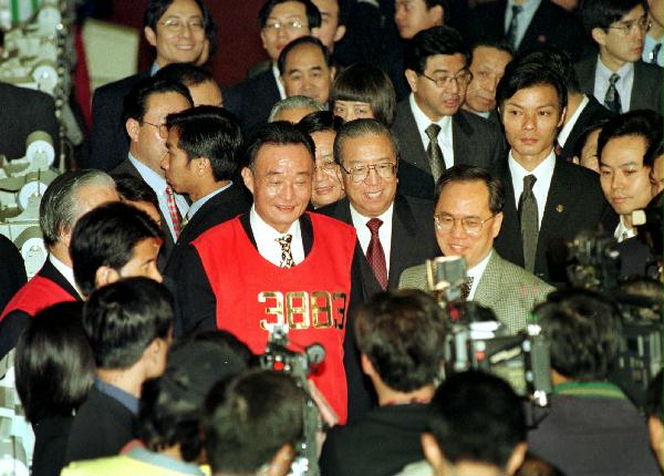 圖片:圖示副總理吳邦國穿上由交易所代表贈予的編號3883交易員背心,細心聆聽代表講解證券櫃位的運作。