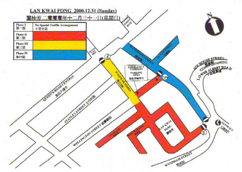 Sogo Department Store Area -------------------------- A single-direction crowd flow will be implemented to allow pedestrians to cross from the Sogo Department Store to the southern side of Hennessy Road. People are urged to use either the Percival Street footbridge to cross Hennessy Road or the Pennington Street footbridge via Jardine's Bazaar to cross Yee Wo Street. People who come out from Kai Chiu Road MTR exit and wish to go to the Sogo Department Store vicinity or Victoria Park should use the Pennington Street footbridge via Jardine's Bazaar. Midnight Gun Ceremony -------------------------- The cul-de-sac near Causeway Bay Typhoon Shelter will be closed at 10 pm and any illegally parked vehicles will be removed promptly. Vehicles will only be allowed to pull up into the slip road entrance to alight passengers. Police Report No.1 Issued by PPRB Please refer to the attached maps (1) and (2) End/1700 hrs, Friday, December 29,2000 (NR) NNNN