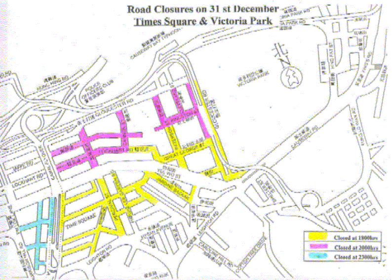 Times Square Area ----------------- The following traffic arrangements will be implemented at 6 pm on New Year's Eve to facilitate a countdown at Times Square: (a) A section of Percival Street between Hennessy Road and Leighton Road will be closed; (b) A section of Russell Street between Percival Street and Canal Road East; a section of Canal Road East between Hennessy Road and Russell Street; a section of Yun Ping Road between Lan Fong Road and Kai Chiu Road; and a section of Lee Garden Road between Hennessy Road and Pak Sha Road will be closed; and (c) Sharp Street East, Matheson Street, Tang Lung Street, Yiu Wa street, Kai Chiu Road, Pak Sha Road, Jardine's Bazaar will be closed. The inner lane of westbound carriageway of Hennessy Road between Jardine's Bazaar and Canal Road East; and the eastbound carriageway of Hennessy Road between Percival Street and 50 metres east of Canal Road East, will be closed from 7 pm. The following arrangements will be implemented from 8 pm on New Year's Eve:- (a) Percival Street between Hennessy Road and Gloucester Road will be closed; (b) Lockhart Road between Canal Road West and Cannon Street will be closed; (c) Jaffe Road between Canal Road West and Cannon Street will be closed; (d) Cannon Street will be closed; (e) Vehicles on Gloucester Road will be prohibited from turning into Canal Road East; and (f) Vehicles travelling north on Canal Road west will be prohibited for turning into Canal Road East. The following road closures will be implemented from 11 pm on New Year's Eve:- (a) A section of Canal Road West, north of Sharp Street West; (b) Sharp Street West between Morrison Hill Road and Canal Road West; (c) Cheung Woo Lane; (d) Wanchai Road between Morrison Hill Road and Bowrington Road; and (e) Bowrington Road. During the implementation of the special traffic arrangements in the vicinity of Times Square, tram service will be maintained on Hennessy Road unless it is necessary to close Hennessy Road during departure of crowds after midnight. The following PLB and taxi stands, carpark and metered parking spaces will be suspended from 6 pm on New Year's Eve and will remain suspended as long as the road closures are in effect: (a) Taxi stand at Russell Street, Kai Chiu Road, Yun Ping Road and Bowrington Road; (b) PLB stands at Pak Sha Road and Tang Lung Street; The following parking meters, on-street parking and car parks will be suspended between 3 pm on New Year's Eve and 4 am the following day:- (a) Metered parking spaces on Yun Ping Road, Lockhart Road east of Marsh Road and Jaffe Road east of Marsh Road; (b) The car parks at Hennessy Centre, Times Square, Leighton Centre, No 40 Yiu Wa Street; and (c) All parking spaces on Lan Fong Road.