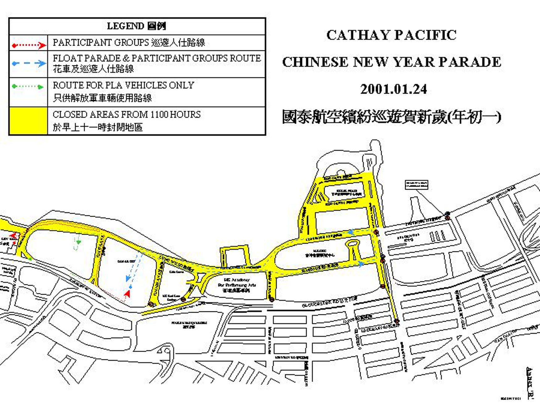 ***************** 警方將於一月二十四日在灣仔實施特別交通及人群管理措施,以便市民觀賞農曆新年花車巡遊。 花車巡遊將於年初一在灣仔北舉行,由下午二時開始,歷時約一個半小時。 為方便花車巡遊舉行,警方將於當日採取特別交通措施,包括封路、改道及封閉泊車位。 封路措施 ---- (甲) 皇后碼頭將於一月二十四日上午六時封閉。 (乙) 下列道路將於一月二十四日上午十一時至下午五時三十分封閉: 一. 介乎愛丁堡廣場東面與演藝道之間的一段龍匯道; 二. 添華道(只開放予解放軍車輛); 三. 添美道(只開放予貼有特別標貼的車輛); 四. 演藝道; 五. 分域碼頭街; 六. 龍景街; 七. 分域街(告士打道以北); 八. 介乎分域街與菲林明道之間的一段港灣道; 九. 告士打道以北的一段菲林明道北行線; 十. 介乎駱克道與港灣道之間的一段菲林明道天橋北行線; 十一. 介乎菲林明道與港灣道之間的一段會議道; 十二. 博覽道; 十三. 博覽道中;及