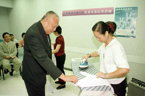 圖片一:行政長官董建華今日參觀社聯再培訓及就業中心時觀看家務助理課程學員學習熨衫技巧。