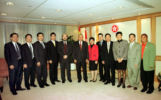 圖片: 行政長官董建華在辦公室與獲二○○一年青年工業家獎的九名得獎者會面。 |
