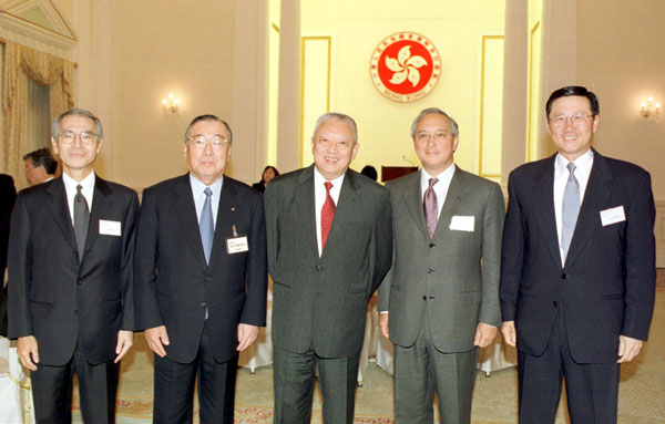 行政長官董建華在香港禮賓府設午宴款待在港舉行第二十四屆全體大會的港日/日港經濟合作委員會委員。 圖示董建華與(左起)日本駐港總領事梅津至、日港經濟合作委員會主席梅田貞夫、港日經濟合作委員會主席錢果豐和貿易發展局主席吳光正合照。