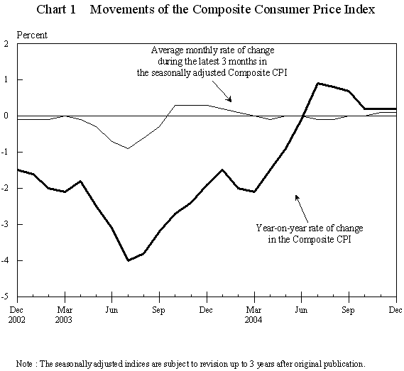 4. For discerning the latest trend in consumer prices, it is also useful to look at the changes in the seasonally adjusted CPIs. For the 3-month period ended December 2004, the average monthly rates of increase in the seasonally adjusted Composite CPI, CPI(A), CPI(B) and CPI(C) were all 0.1%, same as those for the 3-month period ended November 2004.