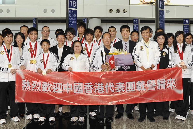 康樂及文化事務署副署長(康樂事務)鄭錦榮(前排右四)和助理署長(康樂事務)陳若藹(左二)在香港國際機場歡迎代表團載譽回港。
