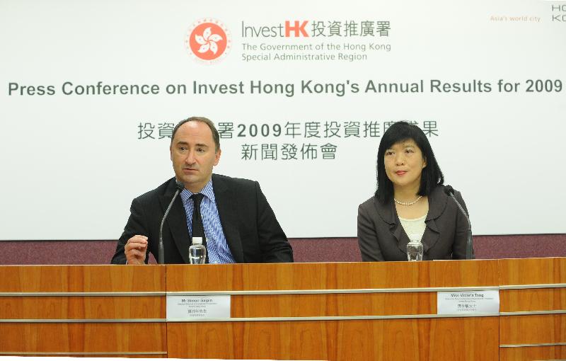 | Director-General of Investment Promotion at Invest Hong Kong, Mr Simon Galpin (left), and Associate Director-General of Investment Promotion at Invest Hong Kong, Miss Victoria Tang, hosted a press conference to announce the department's annual results for 2009. |