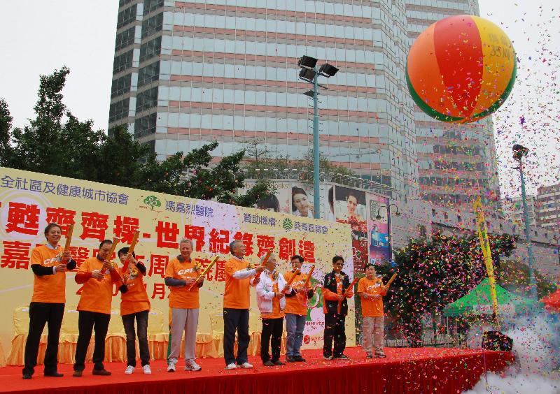 醫院管理局行政總裁蘇利民(左四)今日(一月二十四日)為「心肺復甦齊齊操-世界紀錄齊創造」暨瑪嘉烈醫院三十五周年院慶活動揭幕禮擔任主禮嘉賓,陪同主禮的嘉賓包括葵青區議會主席鄧國綱(右四)、葵涌醫院及瑪嘉烈醫院管治委員會主席方剛(右五)及九龍西醫院聯網總監董秀英醫生(左三)。