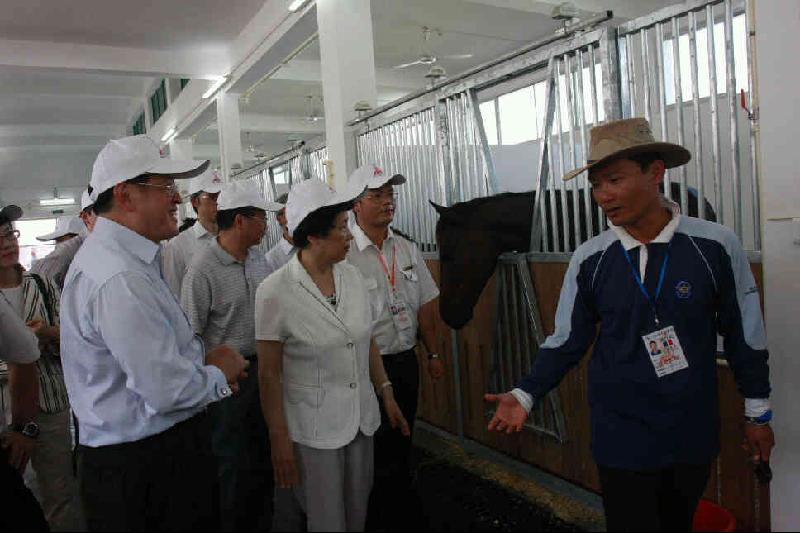 | The Secretary for Food and Health, Dr York Chow, today (September 15) visits the equine disease-free zone in Conghua City, Guangzhou Municipality. Picture shows Dr Chow being accompanied by the Director of Guangdong Entry-Exit Inspection and Quarantine Bureau, Ms Li Yanhui, having a close look at the preparations for the quarantine and prevention of disease of the horses participating in the Asian Games equestrian event. |