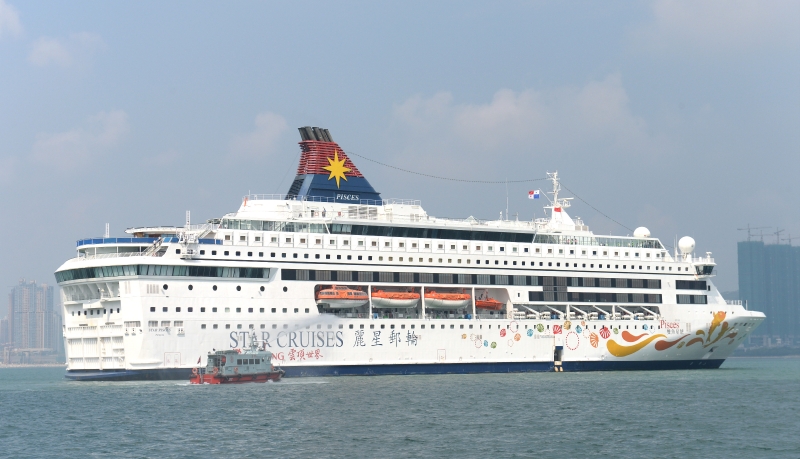 海事處今日(十月九日)聯同多個政府部門與郵輪「雙魚星號」在將軍澳對開海面舉行海上搜索及救援演習。照片顯示當郵輪火警警號響起時,消防船迅速到達現場。