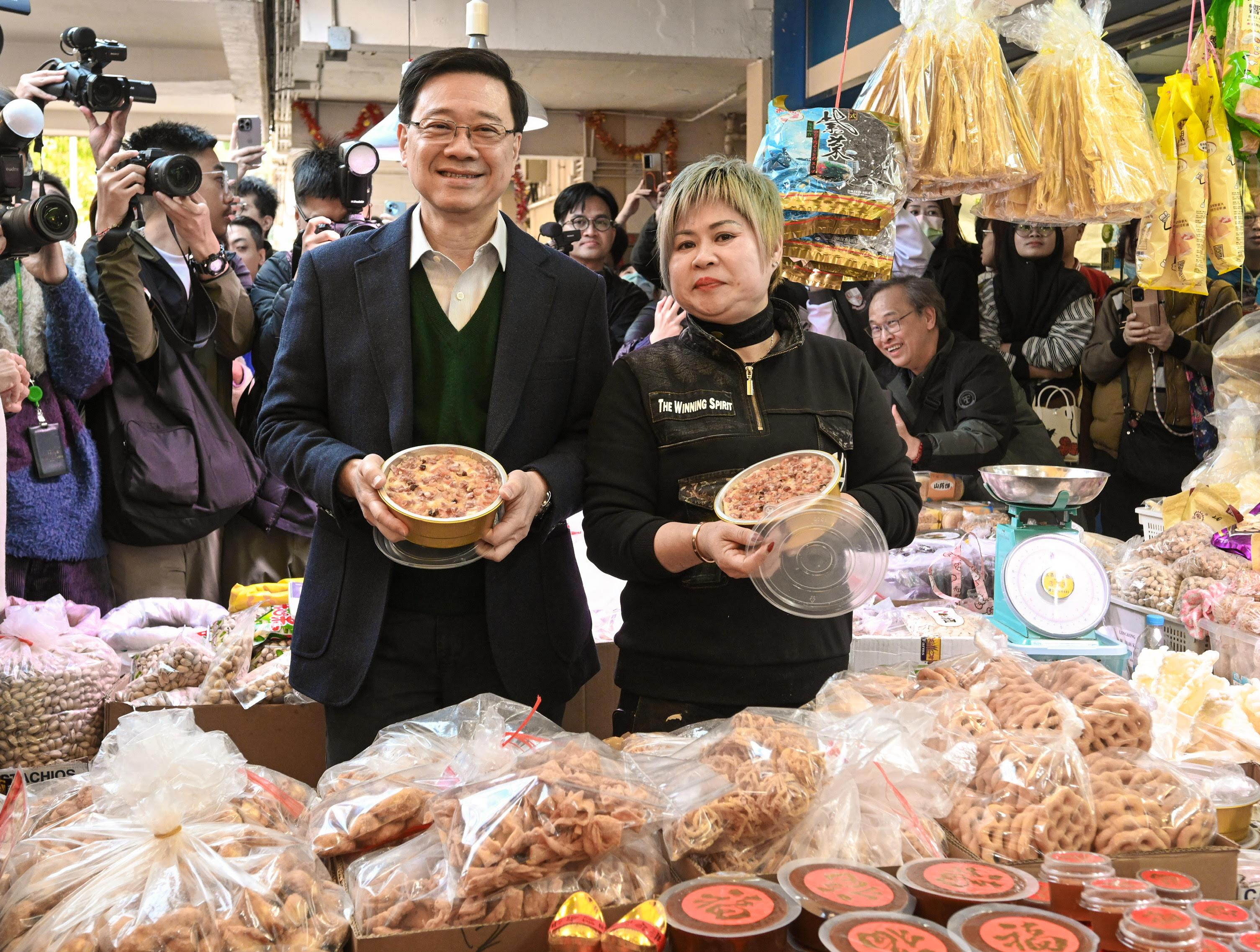 行政長官:大家好。今日已經是年廿六了,所以我趁着今日探街坊。中午,我到了紅磡的社區客廳,了解到社區客廳受到用戶歡迎,特別是洗衣服務方面是很受歡迎的。我在社區客廳裏跟各位用戶一起吃了團年午餐,祝福大家。司、局長在未來數日亦會探街坊,問候和了解各位街坊的生活。我亦很高興順帶來到看看當地的店鋪生意如何,我買了蘿蔔糕——這個我很喜歡吃的,回去會和太太分享——亦聽到生意是符合預期。