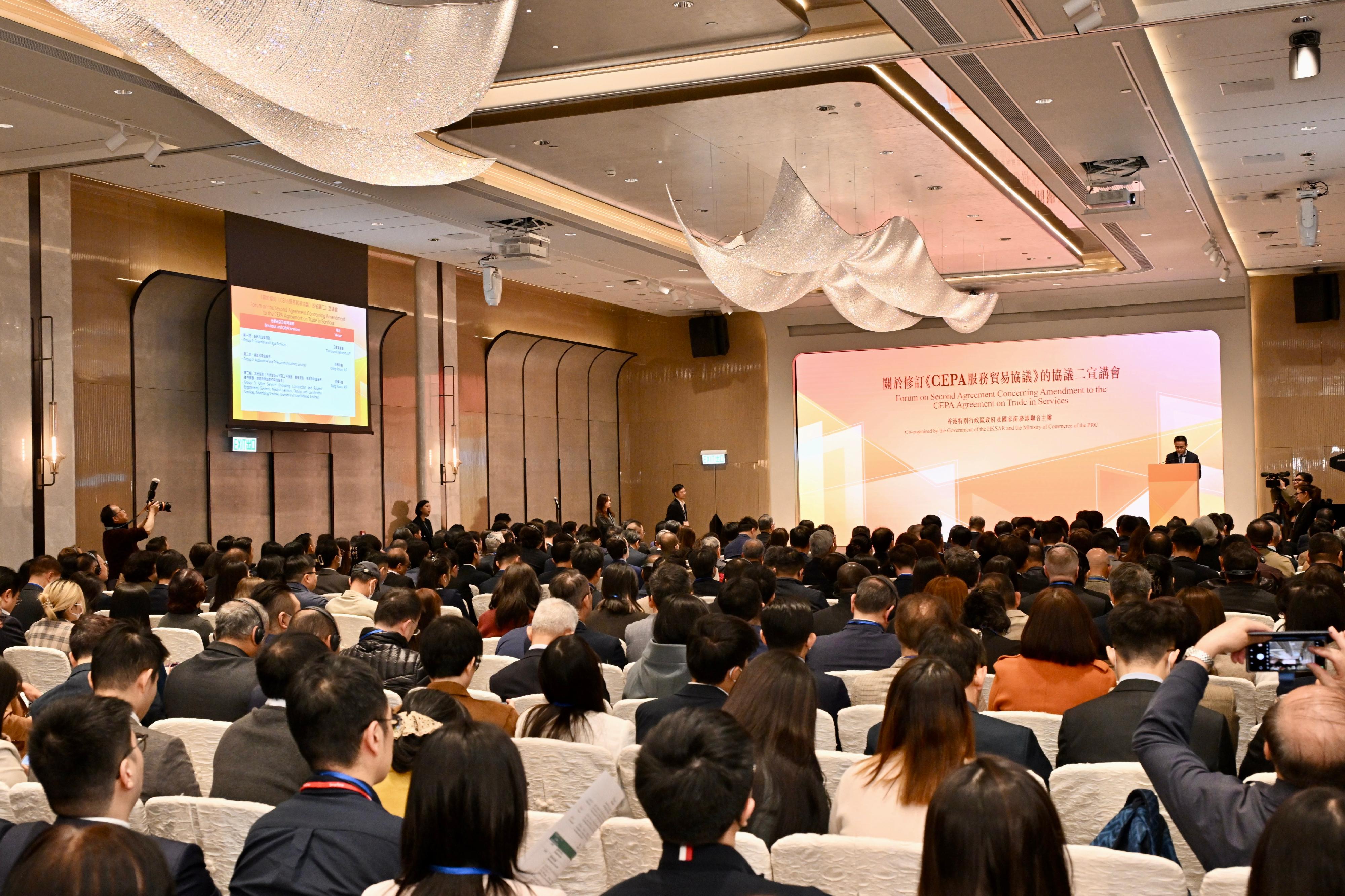 Over 350 people, including representatives from local and foreign chambers of commerce, consulates, major trade associations and professional sectors, participated in the forum. The forum comprised three breakout sessions covering financial and legal services; audiovisual and telecommunications services; and other services (including construction and related engineering, medical, testing and certification, advertising, and tourism and travel related services). Representatives from over 20 central ministries and HKSAR Government bureaux and departments briefed participants at the forum on the content and implementation arrangements of the Amendment Agreement II, as well as the criteria and procedures for application for preferential treatments, and answered questions from the trade.