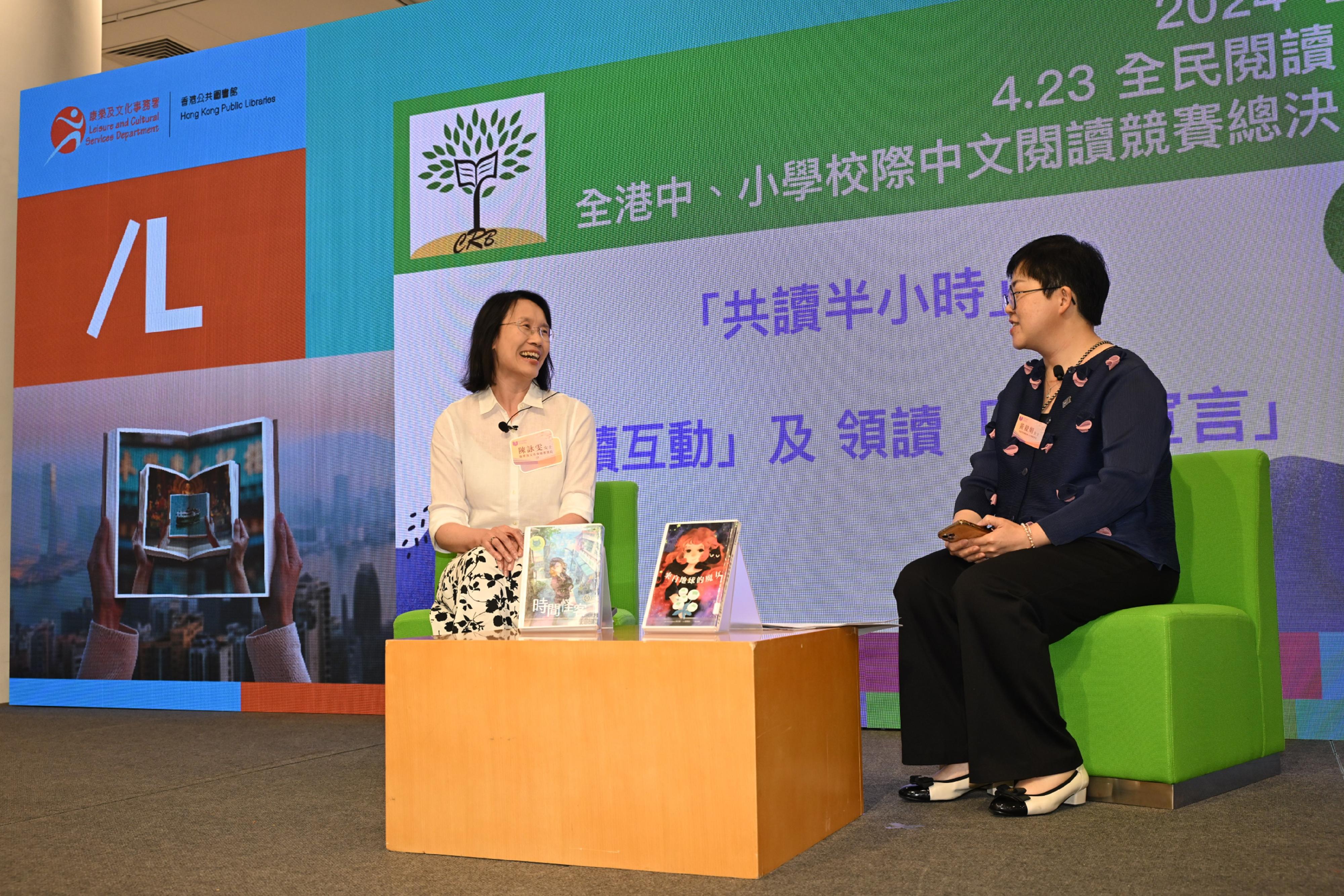 康文署署長陳詠雯出席在香港中央圖書館舉行的共讀半小時活動,和參與的學生分享閱讀心得,提到閱讀可以開闊眼界和提升修養,並鼓勵學生持續閱讀。
