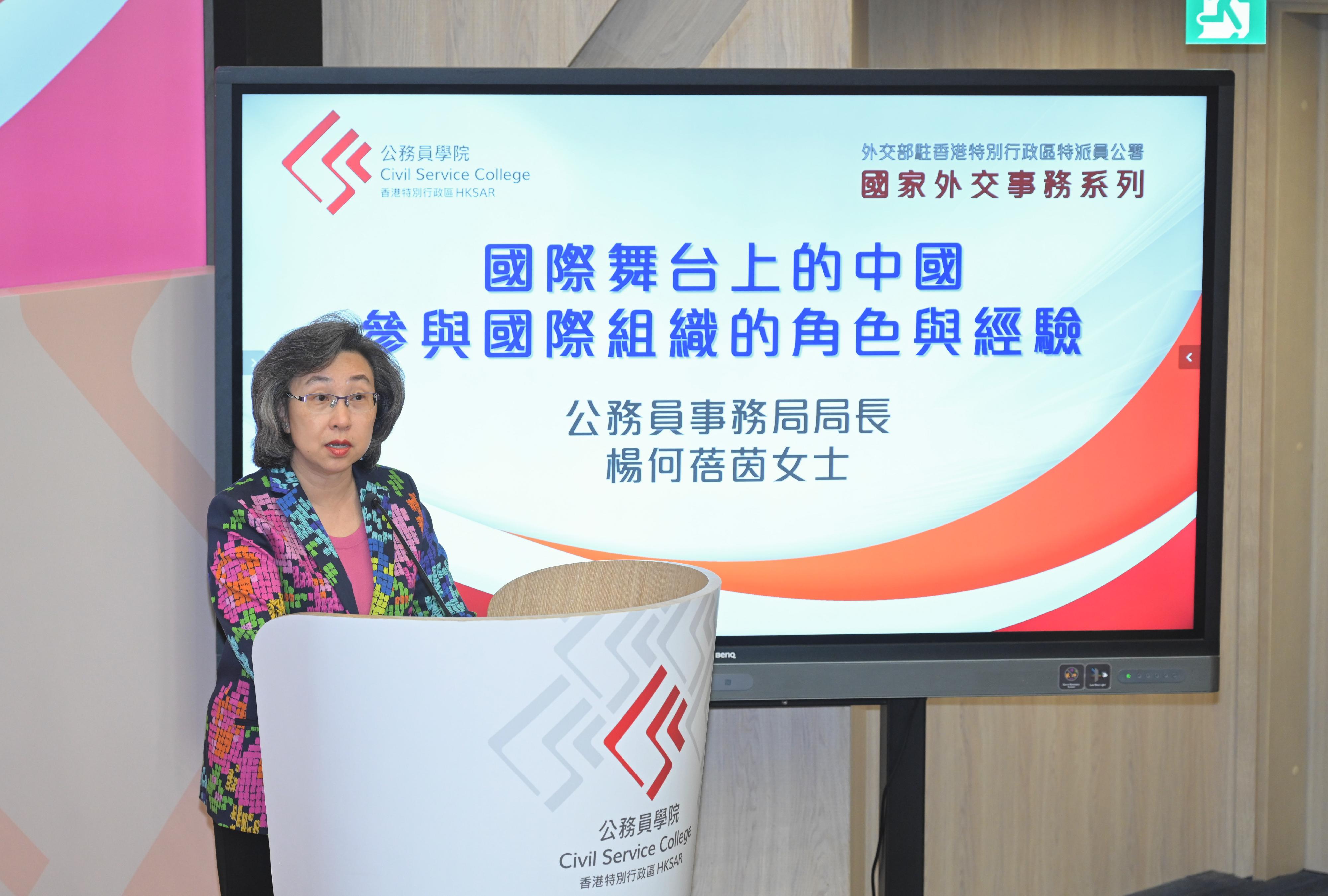 公務員事務局局長楊何蓓茵在講座致辭時表示,國家秉持和平、發展、合作、共贏的理念,為解決全球性問題貢獻中國智慧,充分展現負責任大國的擔當和風範,為促進世界和平與繁榮作出重要貢獻。香港擁有「一國兩制」的優勢,作為國際金融、航運、貿易中心,香港致力推動多領域的國際合作。她表示,特區公務員肩負着聯通國家與世界的使命。在中央政府的支持下,特區政府派出獲外交部推薦的青年公務人員參與聯合國初級專業人員方案,讓他們為國家和國際組織貢獻所長。