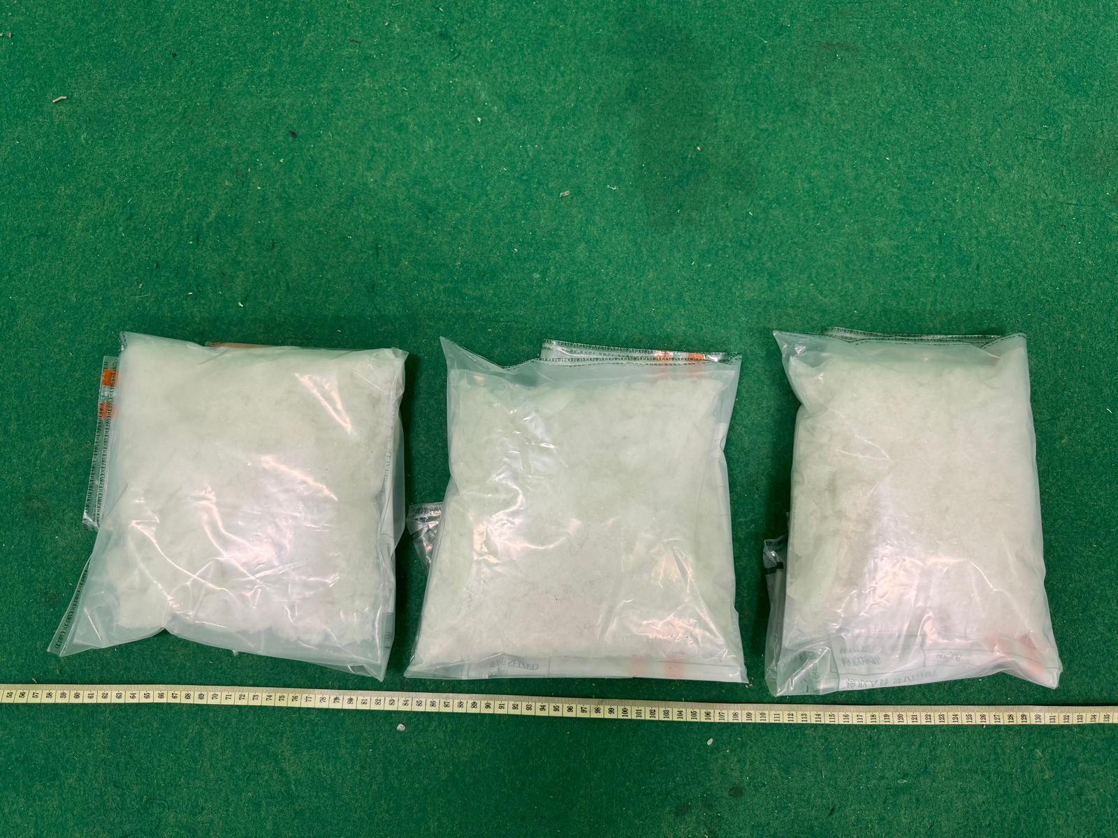 一名七十歲的男旅客今日從南非約翰內斯堡飛抵本港。海關人員清關時,在其寄艙行李箱的夾層中發現該批懷疑冰毒,遂把該名男子拘捕。