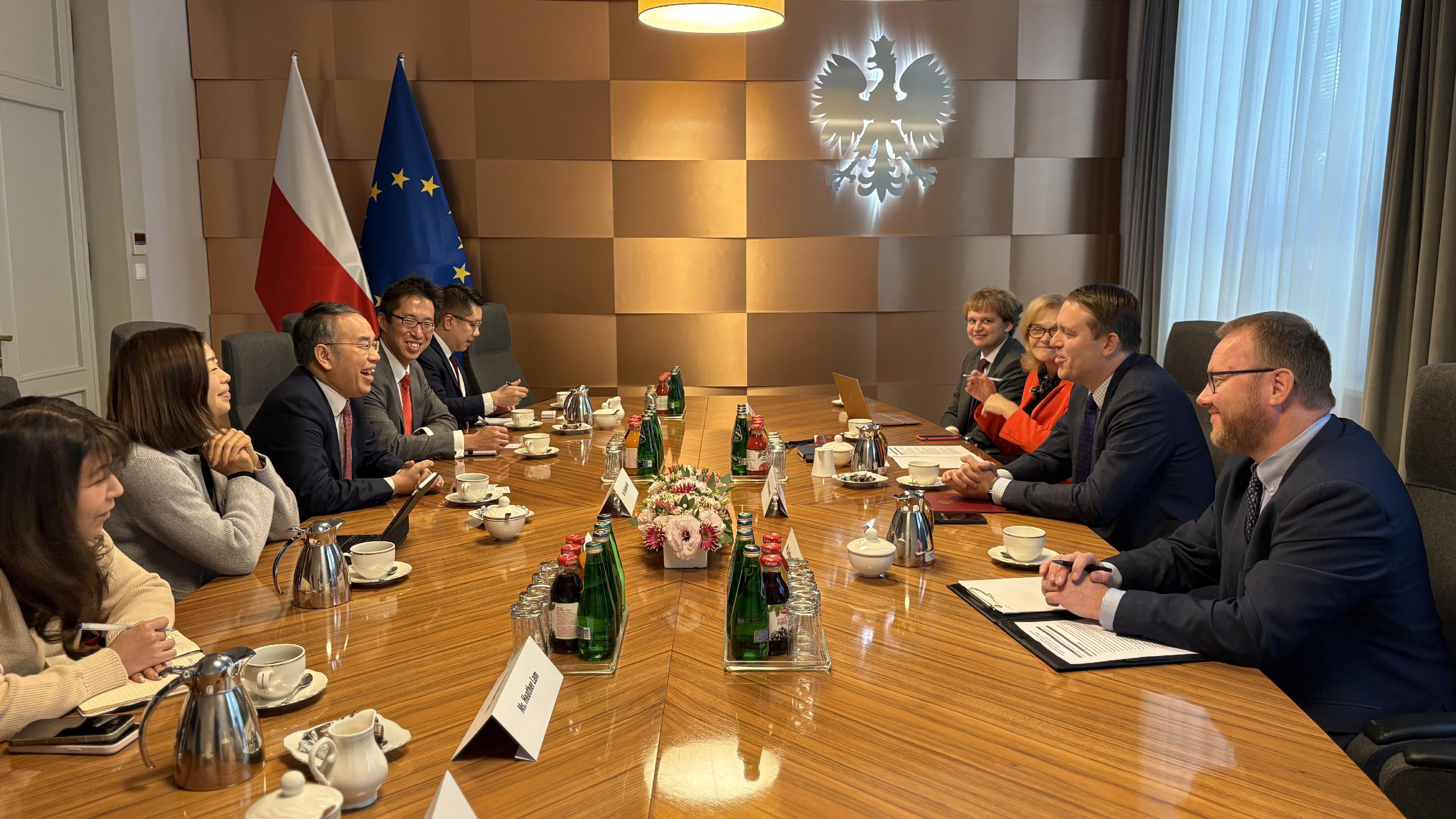 隨後,許正宇與波蘭經濟發展及科技部副部長Michał Baranowski會面,向他介紹香港在財富管理和股票巿場的亮麗表現,以及各項推動金融增長的新措施,包括建立國際黃金交易巿場,當中涵蓋由政府牽頭的香港黃金中央清算系統。