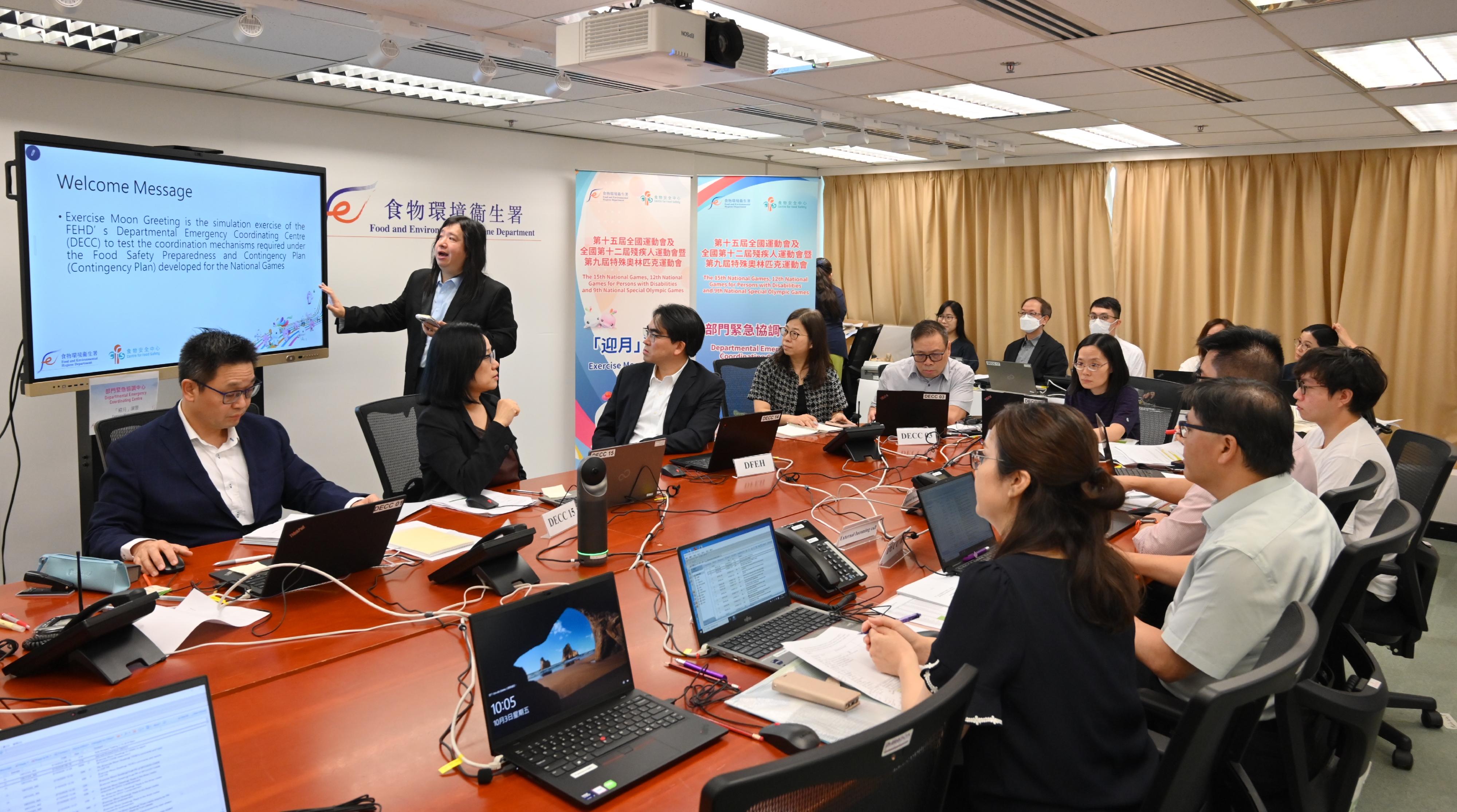 演習模擬在賽事期間接獲涉及運動會相關人員的懷疑食物投訴及中毒個案。食環署隨即按《應變計劃》全面啓動緊急協調中心,迅速在相關食肆作出調查,並採取控制措施,保障食物安全。緊急協調中心亦同時協調與全國運動會香港賽區統籌辦公室和其他相關單位的通報及協作。