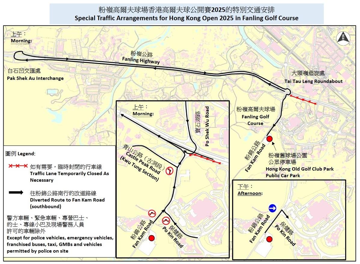 Given that double yellow lines have been put in place at the entrances and exits of the Fanling Golf Course and its car park, and taking into account the narrow road conditions, it will be prohibited to park, pick up or drop off on Fan Kam Road near the golf course and its vicinity to ensure smooth traffic flow. Passengers travelling to the event venue are required to alight on Po Kin Road.