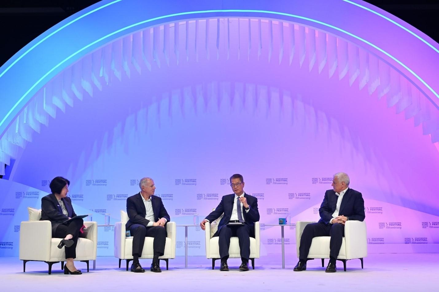 The Financial Secretary, Mr Paul Chan, joined a panel discussion alongside the Director-General of Investment Promotion of InvestHK, Ms Alpha Lau; Group Chief Executive of HSBC, Mr Georges Elhedery; and Group Chief Executive of Standard Chartered, Mr Bill Winters.