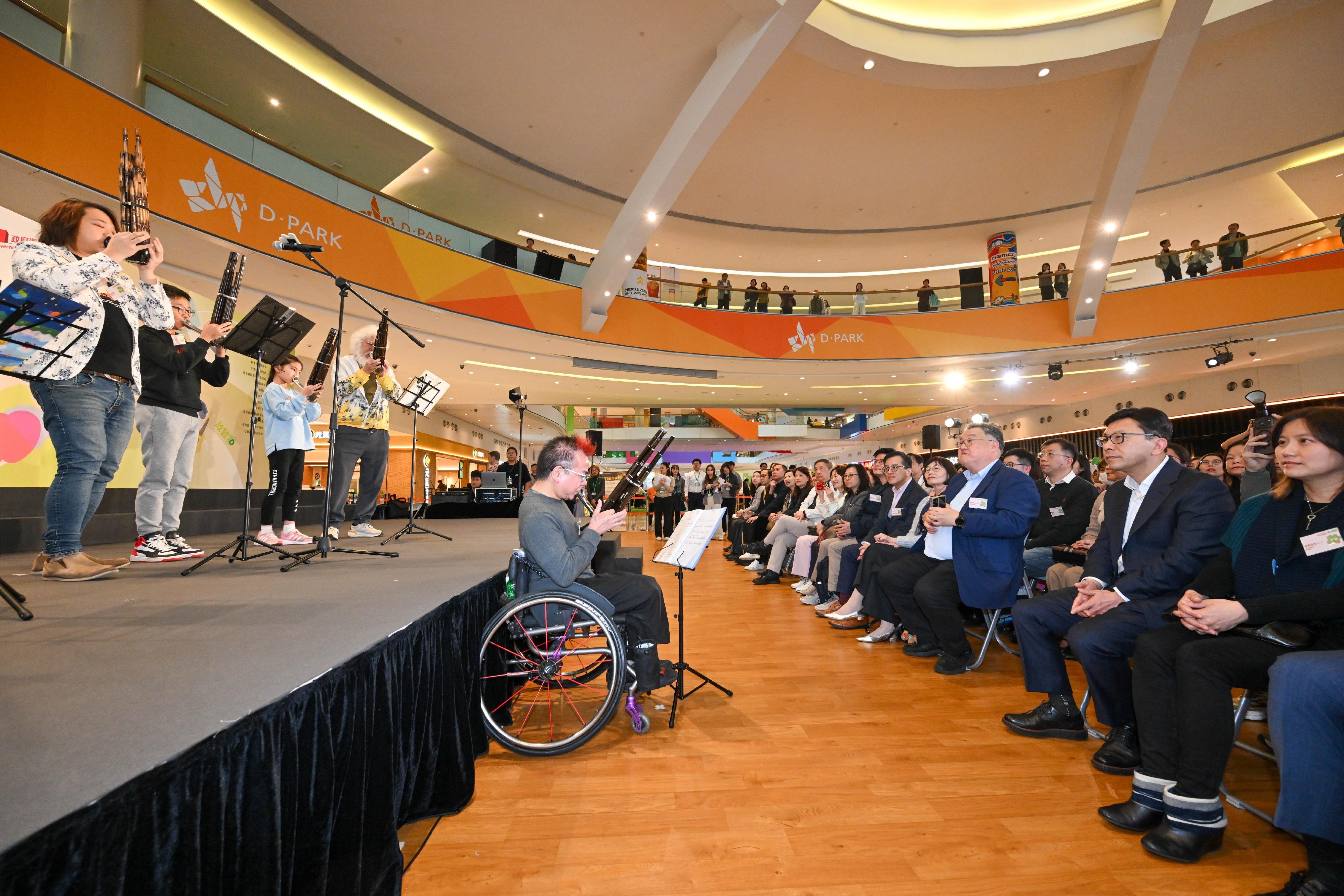 剛剛我會形容是「老幼同台、傷健共融」的演奏隊為我們表演了兩首歌,我覺得選曲很好,他們選了《男兒當自強》,其實不只是男人,在精神健康方面,要人人當自強;第二首是《滄海一聲笑》,香港其實很少見到滄海,但我覺得笑是永遠是好的,起碼無論你的處境多難,一笑能解千愁。所以結束前我希望借他們的兩首歌鼓勵大家,希望大家「人人自強,笑口常開」。