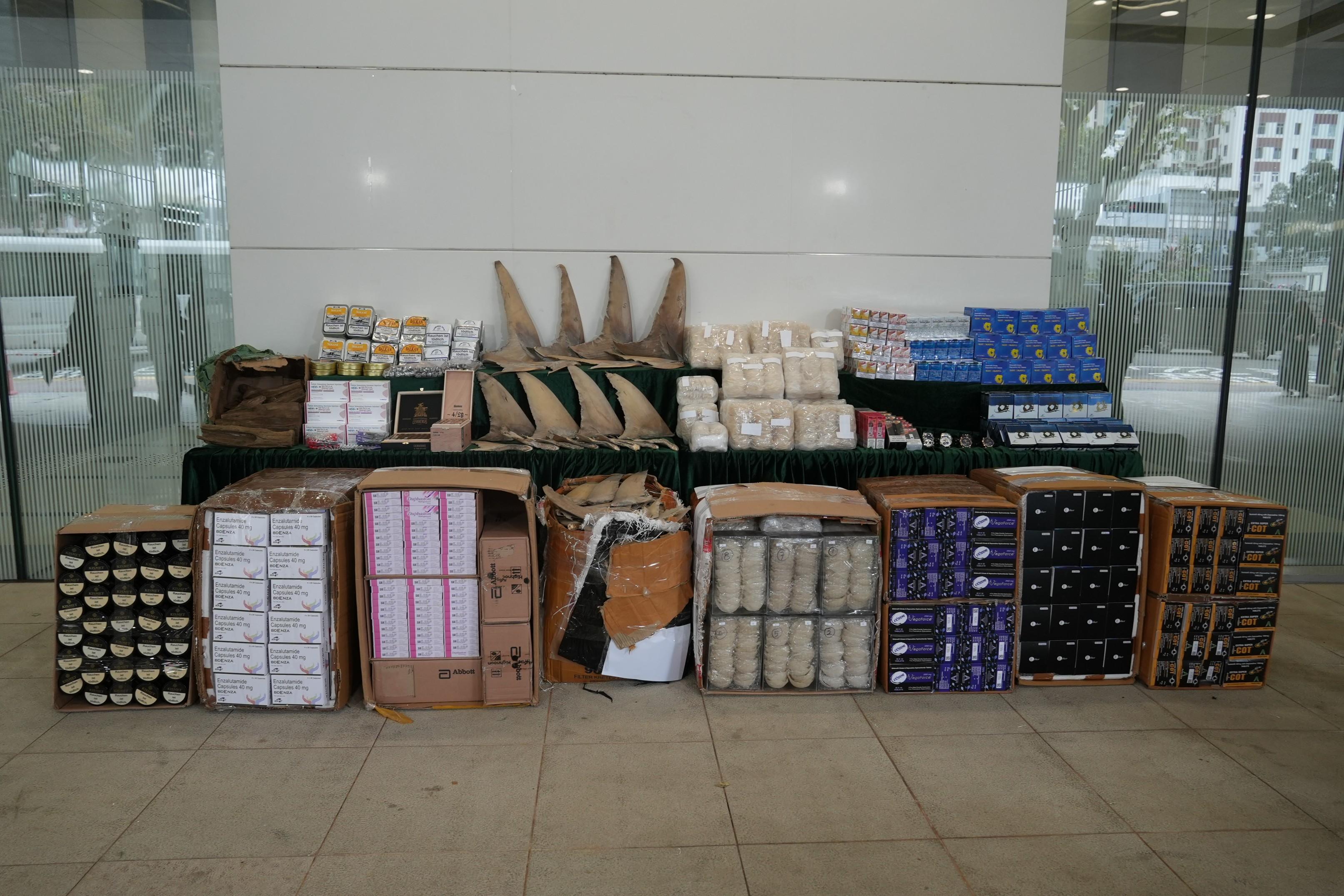 海關透過情報分析及風險評估,在上述日子分別抽查兩艘由香港出發前往澳門的內河船。經查驗後,海關在該兩艘船上檢獲大批懷疑走私貨物,包括懷疑藥劑製品、煙草產品、燕窩,以及懷疑受管制屬瀕危物種的魚翅及沉香。