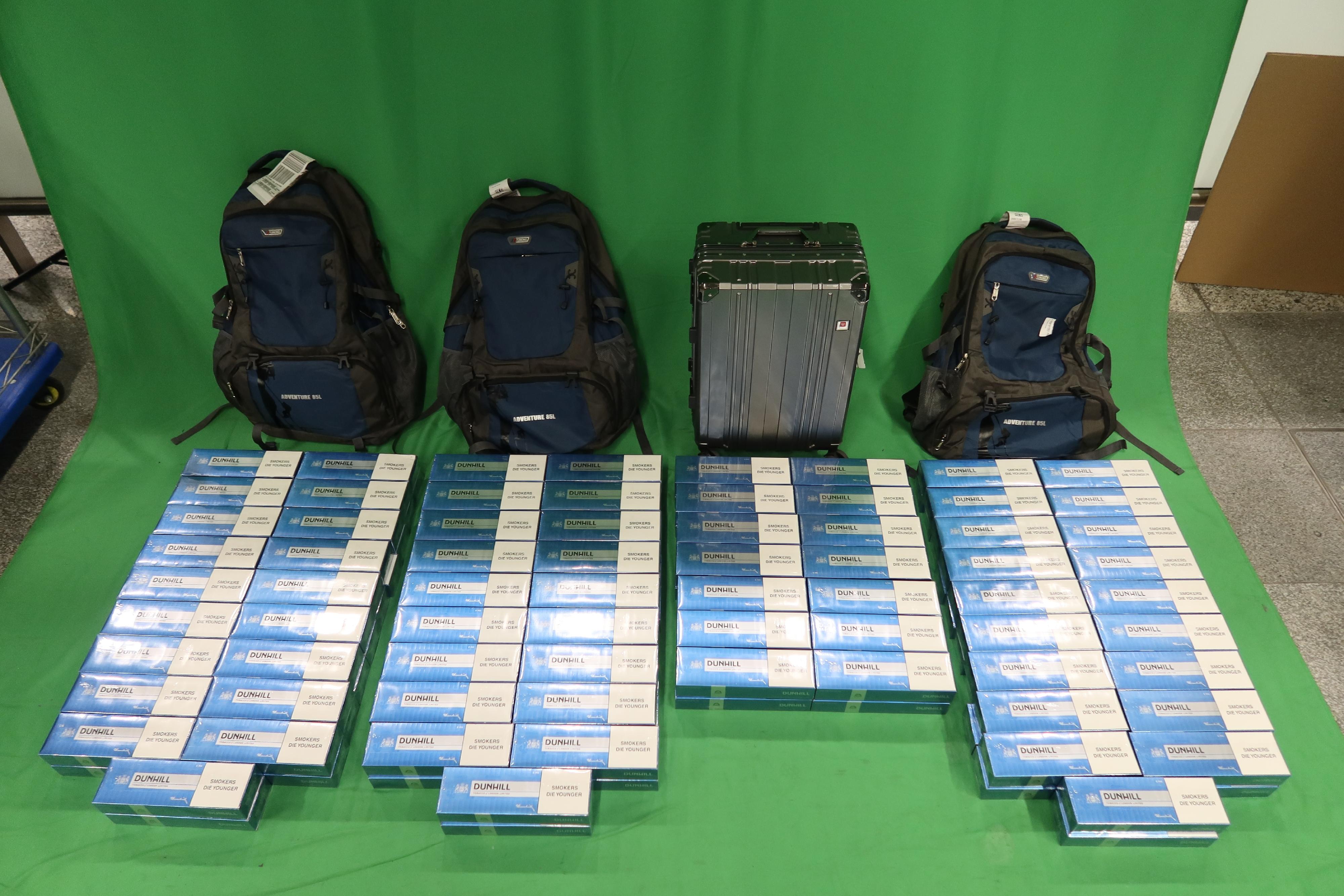 Customs officers intercepted a 48-year-old incoming female passenger, a 37-year-old incoming male passenger and a 55-year-old incoming male passenger at Hong Kong International Airport on November 26, 2025. About 98 600 sticks of duty-not-paid cigarettes, with an estimated market value of about $404,000 and a duty potential of about $326,000 in total, were seized from their baggage. They were subsequently arrested.