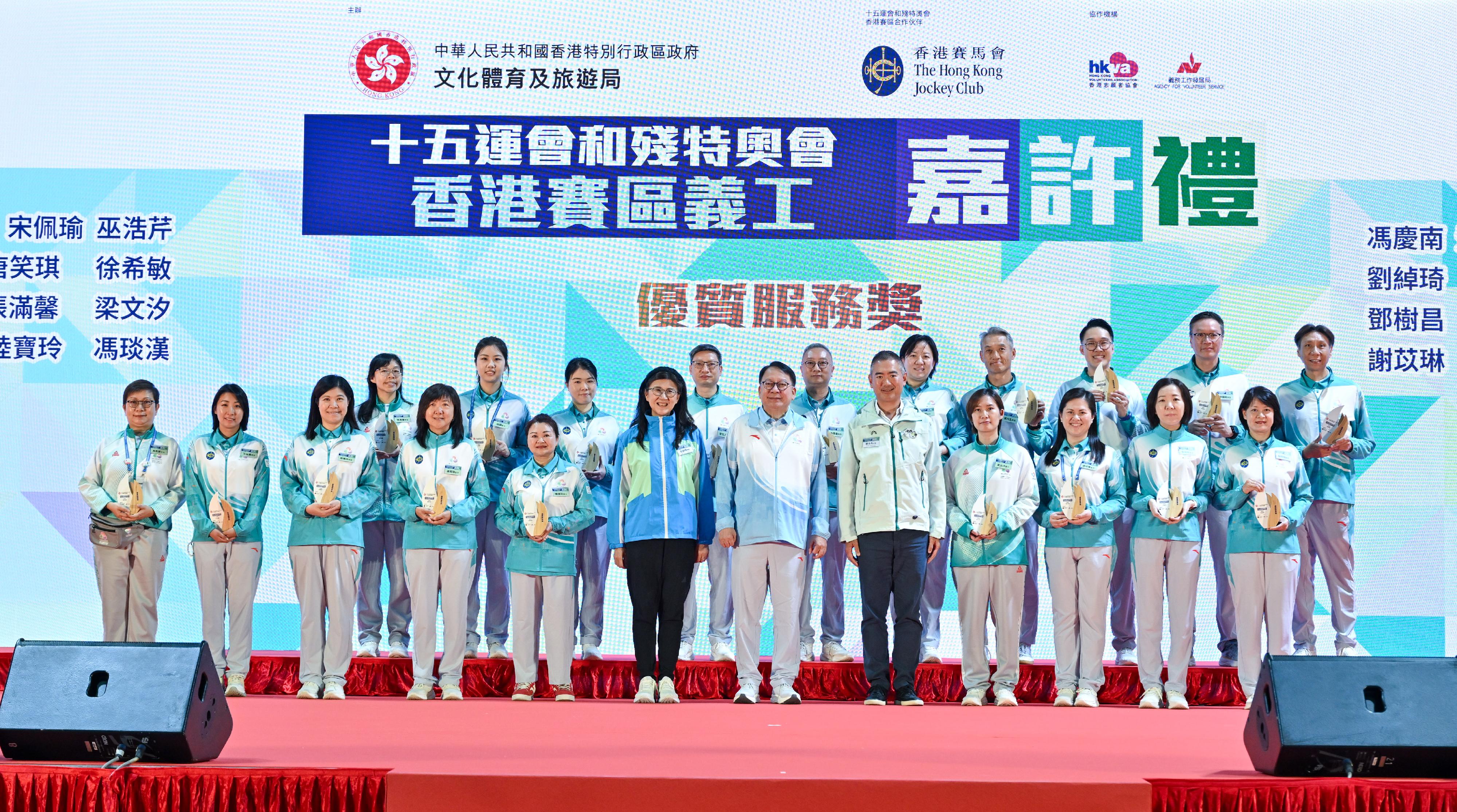 大家好!今日我很高興來到香港單車館,與大家一同出席這個意義非凡的嘉許禮,一同向第十五屆全國運動會(十五運會)、全國第十二屆殘疾人運動會和第九屆特殊奧林匹克運動會(殘特奧會)香港賽區的全體義工,表達我們最誠摯的感謝!