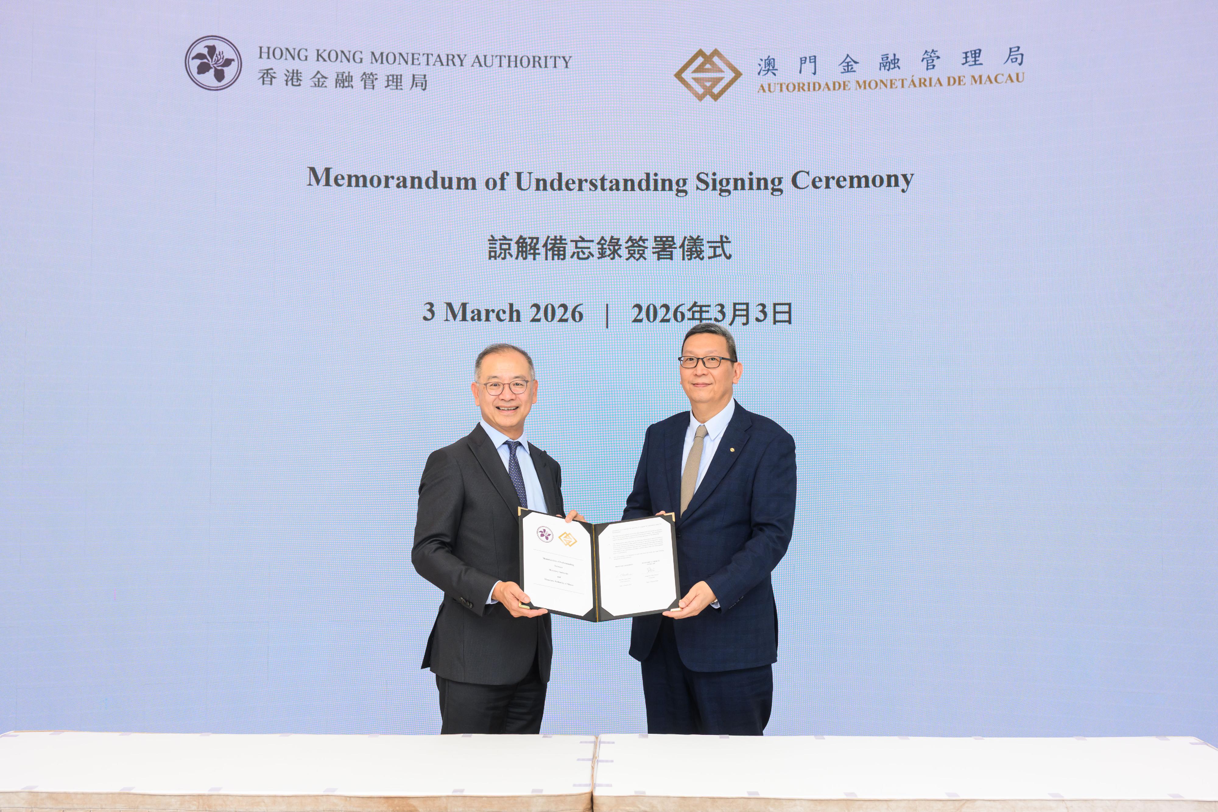 香港金融管理局(香港金管局)與澳門金融管理局(澳門金管局)代表今日(三月三日)進行會面,雙方就進一步加強兩地金融多維度合作展開交流,並於會面期間共同簽署經修訂的《諒解備忘錄》。