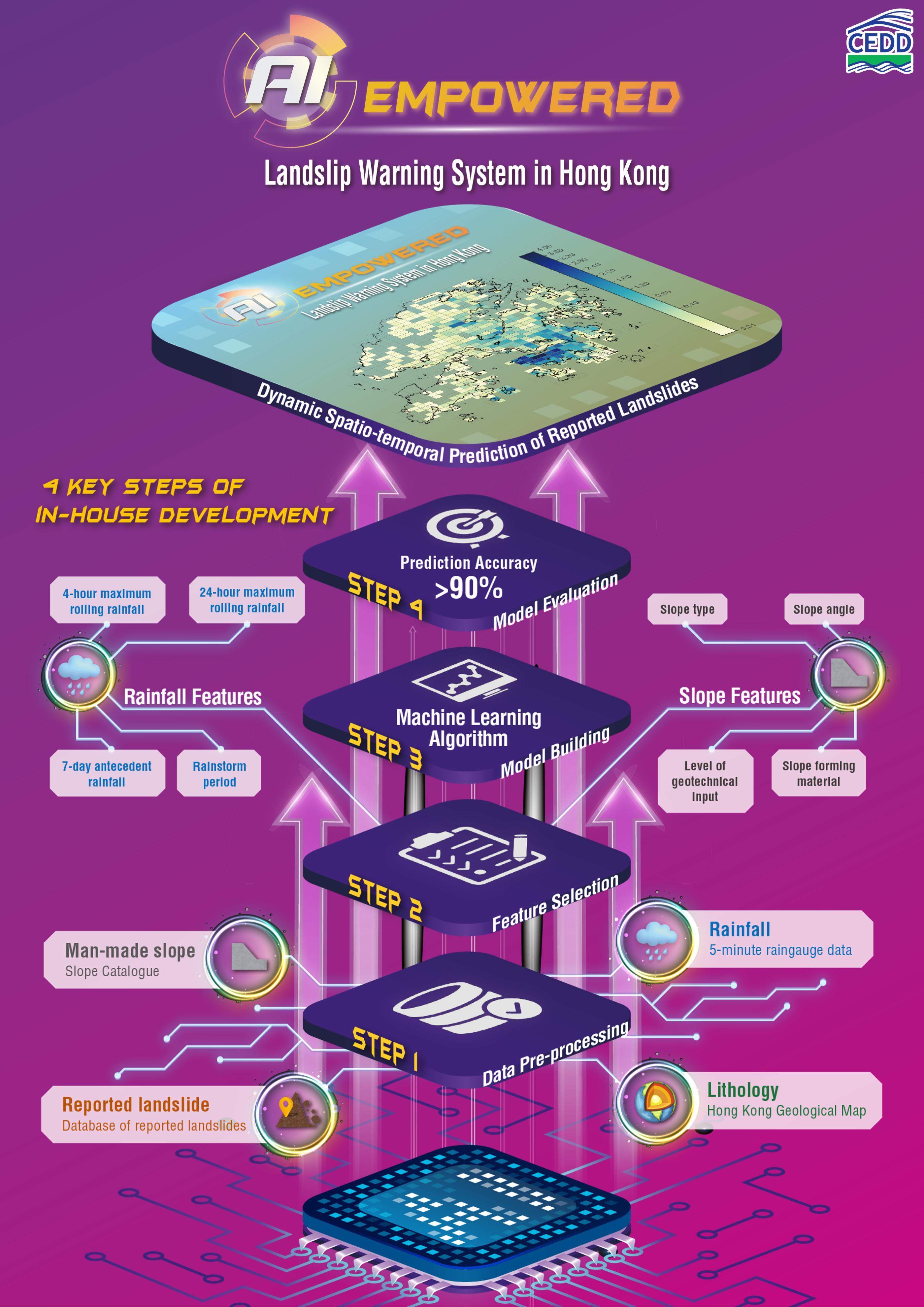 In the field of disaster prevention, the in-house team of the CEDD developed the fifth-generation AI Landslip Warning System, applying artificial intelligence and big data technology to analyse the rainfall and landslide data in Hong Kong. This significantly improves the accuracy of risk assessment and issuance of warning signals. In addition, the department also developed a number of intelligent safety management systems, including the occupational health and safety management and monitoring system for confined spaces that can achieve instant alerts and closed-loop management; the CANOPUS - Smart Safety Harness monitoring system focusing on safety for working-at-height which can ensure that safety harnesses are securely attached; and the pioneering multi-channel certification mechanism that can enable real-time tracking and predictive alerts of personnel and equipment. The above inventions all received the gold medals with the congratulations of jury at this Exhibition.