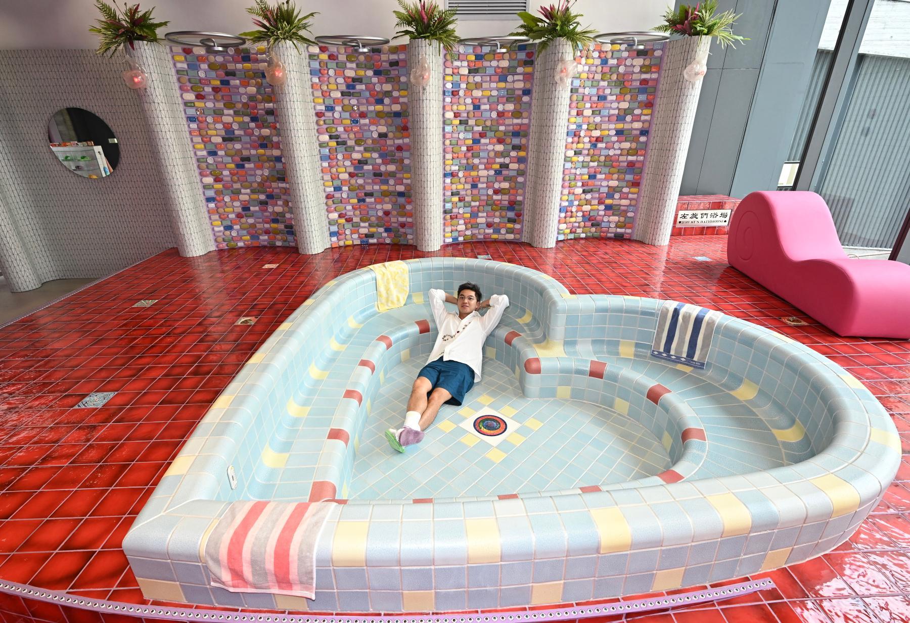 Chan drew inspiration from bathing cultures across different places and historical periods. The site-specific installation "LEVO LOVE" is composed of more than 1 200 handcrafted ceramic tiles. To create this contemporary version of a "bathhouse" that is uniquely for Hong Kong, Chan travelled to Jingdezhen to learn ceramic firing techniques to produce custom tiles and decorative motifs specifically for the exhibition. Its heart-shaped form evokes immediate associations with love and romance, while also functioning as a spiritual symbol of emotion. Visitors are invited to step into the pool, dissolving the divide between the public and the private, and explore a unique sensory journey about distance, intimacy, and publicness.