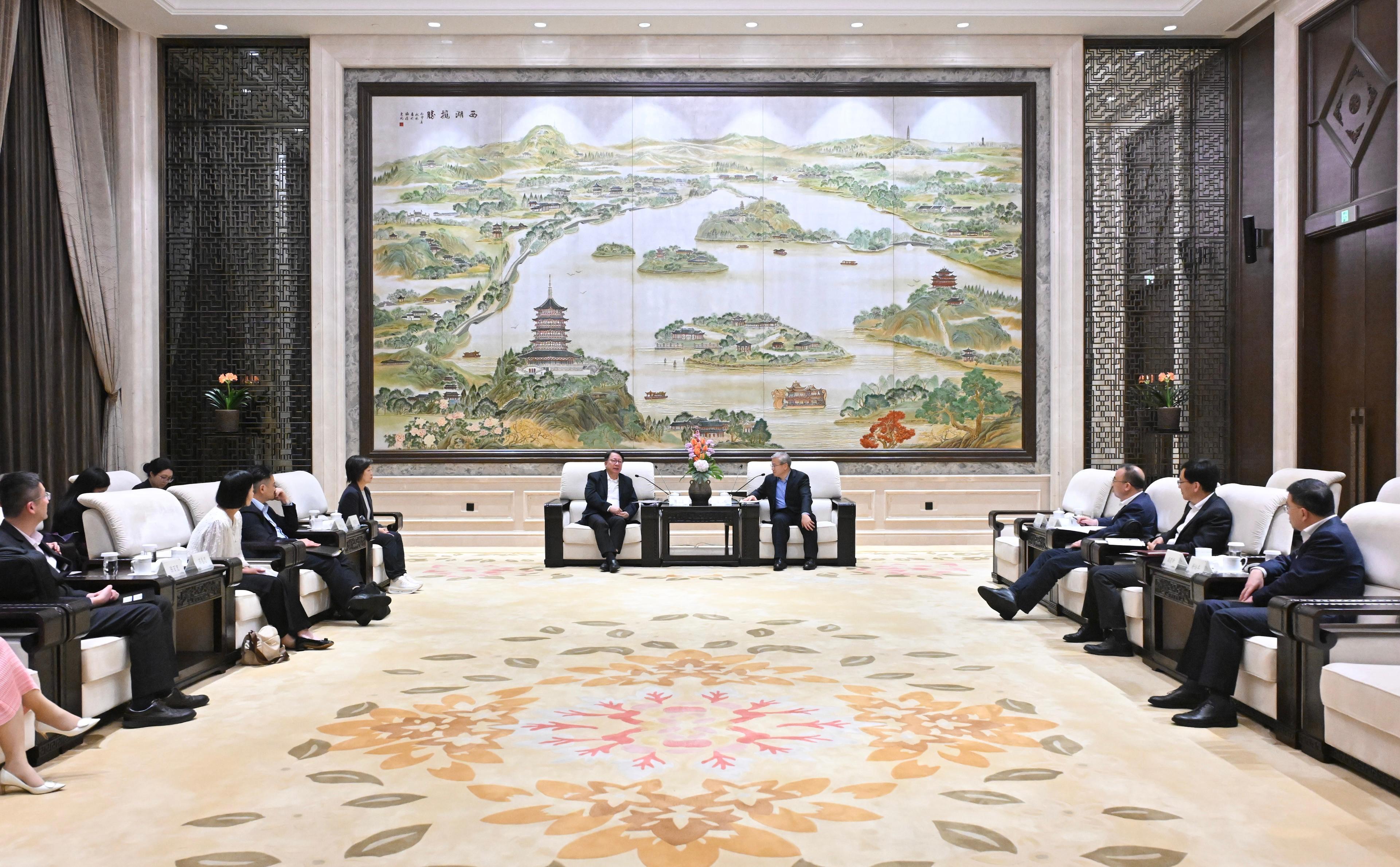In the evening, Mr Chan and the delegation arrived in Hangzhou, where they met with member of the Standing Committee of the CPC Zhejiang Provincial Committee and Executive Vice Governor of Zhejiang Province, Mr Xu Wenguang, and other Zhejiang provincial officials. They exchanged views on further deepening Zhejiang-Hong Kong co-operation, particularly on strengthening exchanges, co-operation, and development with Mainland institutions in the education field.