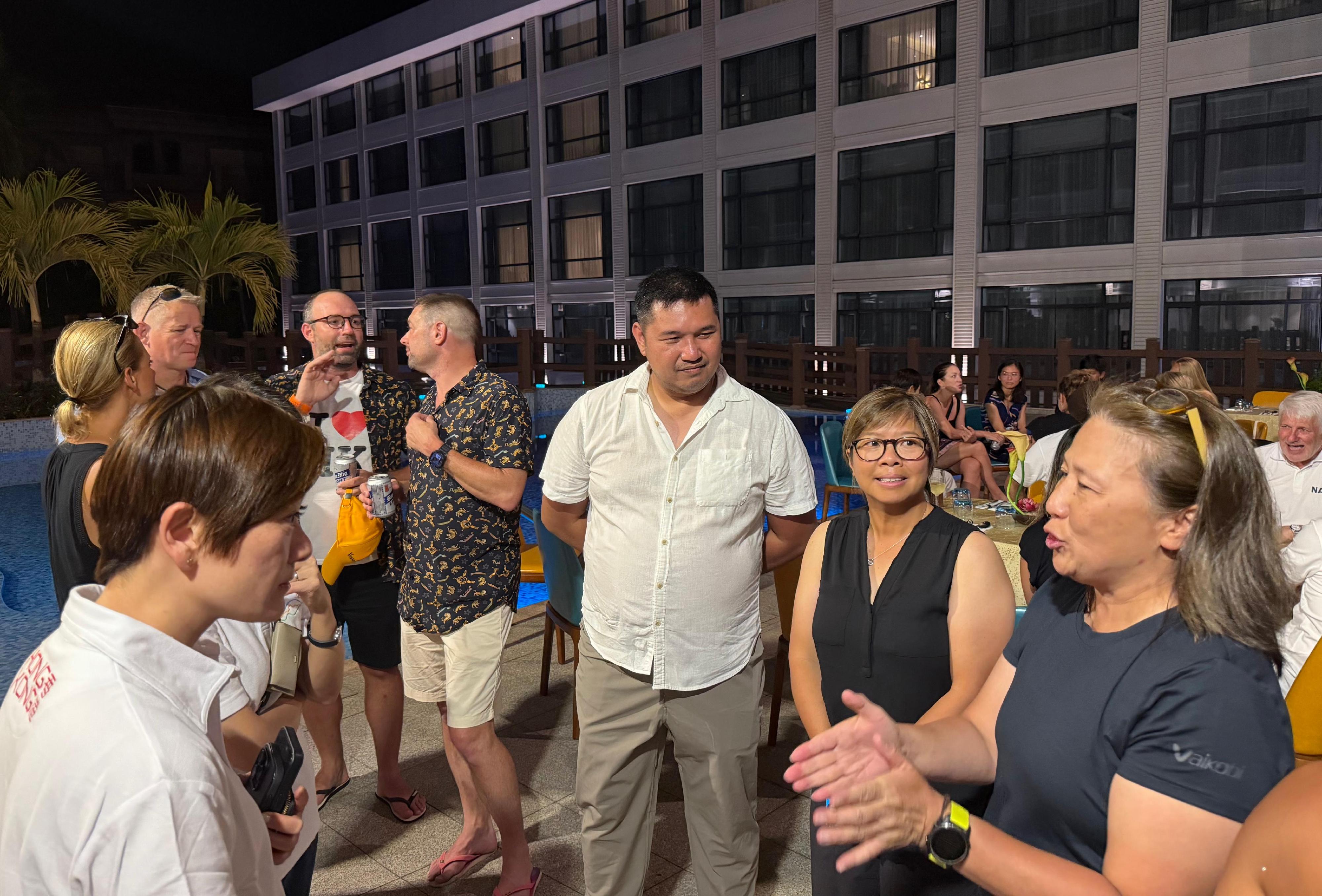 To further engage with the Hong Kong teams and strengthen exchanges with local counterparts, the Singapore ETO hosted a "Hong Kong Night" dinner yesterday (April 25), attended by about 40 guests, including representatives from Hong Kong teams, the BDBA, the PDBF, the local government unit of the Municipality of Malay, and the International Dragon Boat Federation. The evening facilitated active exchanges on dragon boat training and race experiences, as well as exploration of further collaboration and participation in future events.